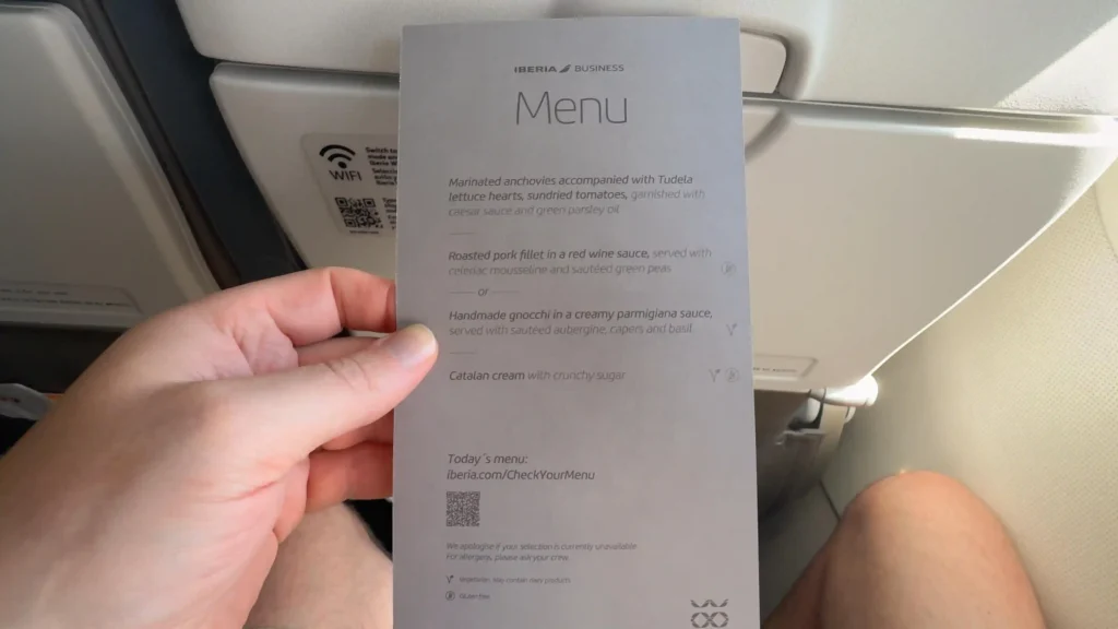 First, you’re handed a proper printed menu, which is a small touch but instantly makes the service feel more premium and intentional. And unlike many European carriers that serve a cold tray or something forgettable, Iberia consistently delivers a full onboard meal on these longer intra-Europe routes.