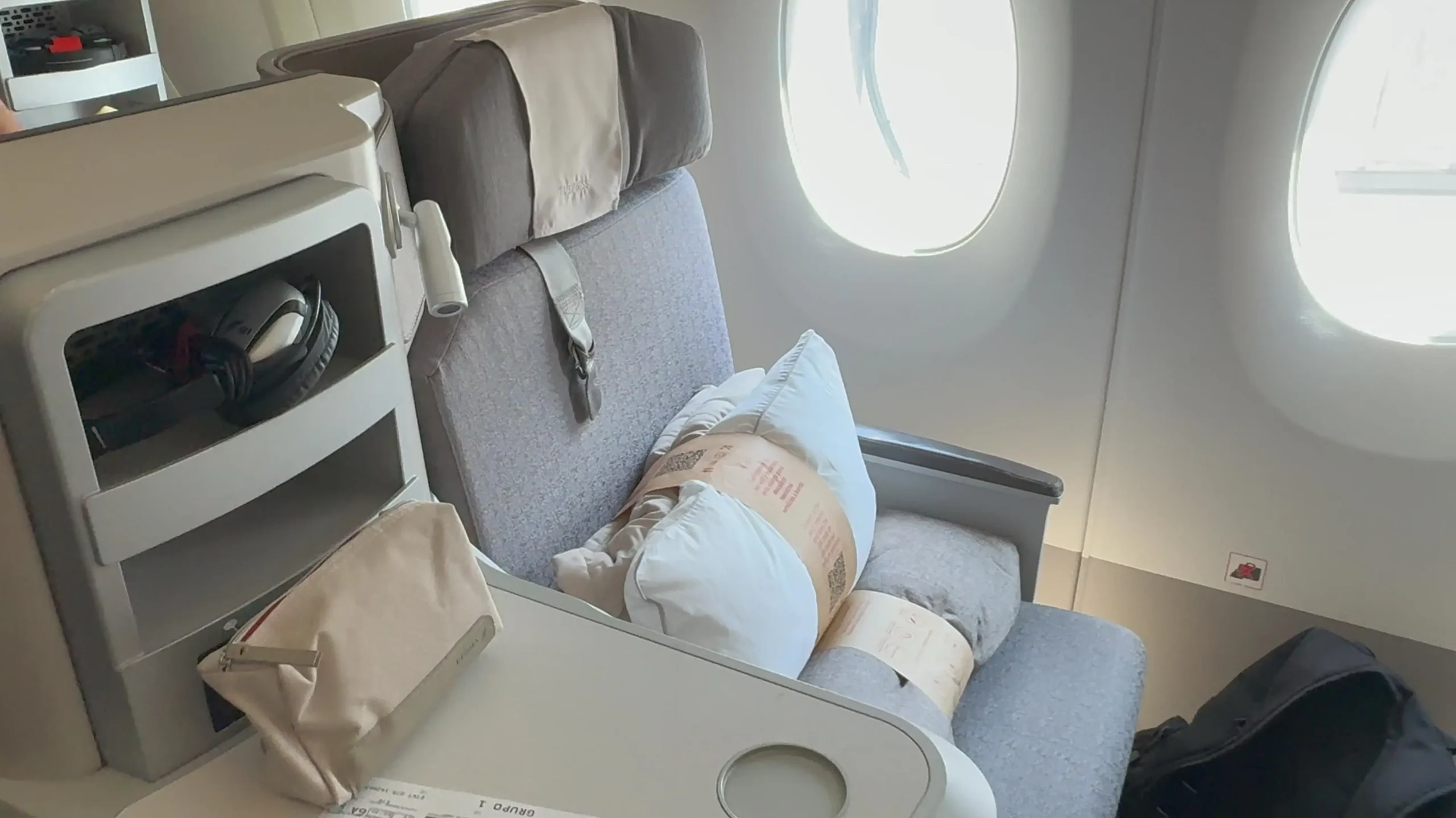 Waiting at the seat were a soft duvet, large pillow, and a thin mattress pad, all of good quality and perfect for turning the seat into a cozy bed in the sky. An amenity kit, featuring products from a Spanish brand, was also provided — a thoughtful touch that adds a premium feel.