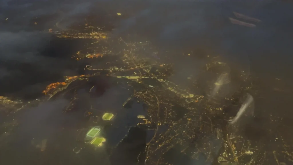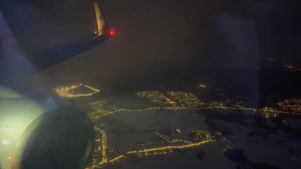 Arrival into Oslo brought yet another change in atmosphere. Unlike the golden light above the clouds, Oslo was grey, cloudy, and covered in snow, creating a completely different scene on the ground. In a way, it felt like experiencing several seasons in a single flight — departing under overcast skies, cruising above glowing winter sunlight, and arriving in a cold and wintry Norway.