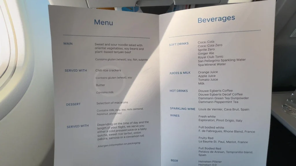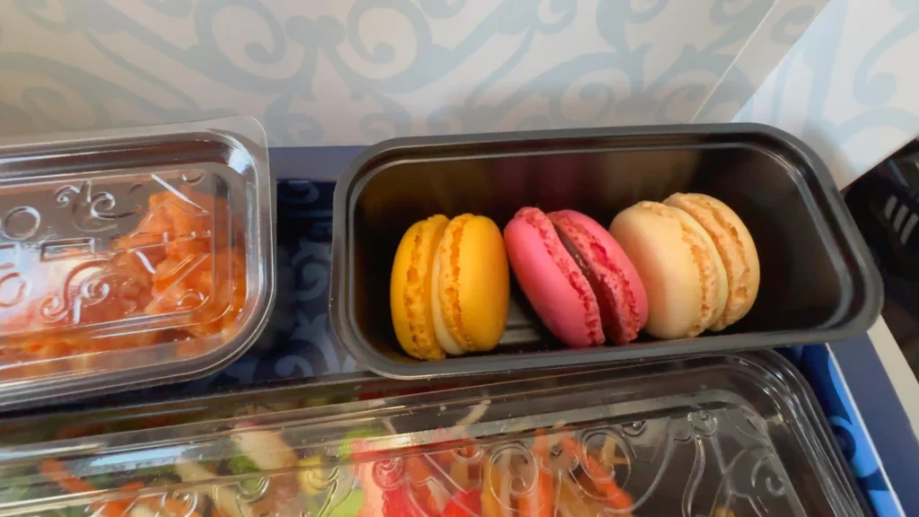 On this flight, the main course was noodles with teriyaki beef. It turned out to be a very pleasant surprise. The dish had a delicious smoky flavour and was genuinely tasty — easily better than I had expected for a short intra-Europe sector. Dessert was macarons, which made for a nice sweet finish to the meal.