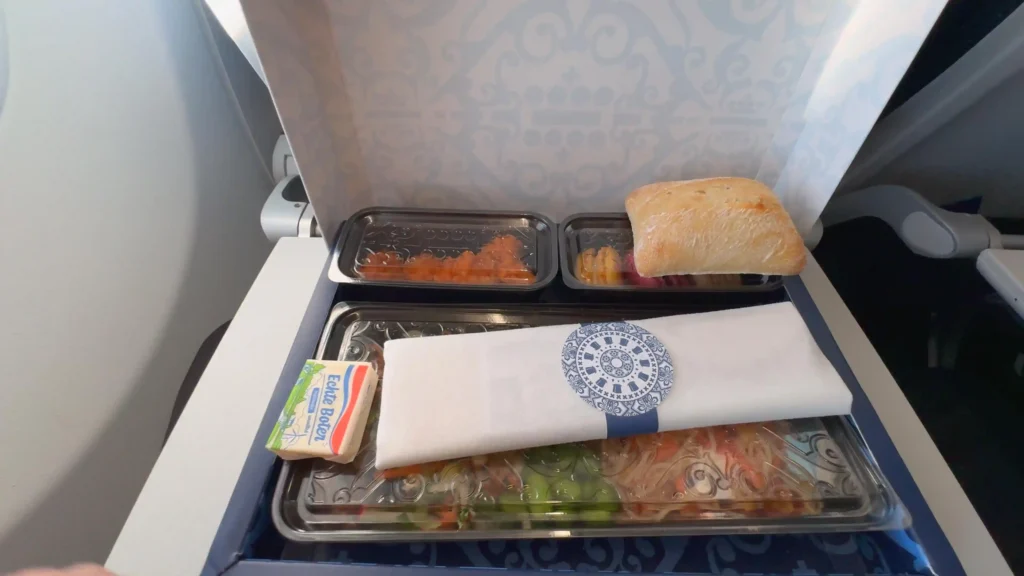 Inside, the presentation was neat and well organised. There was a nicely designed menu, along with the main course, bread and butter, a small packet of salty snacks, and dessert. As is typical for European Business Class on a short flight, everything was served cold.