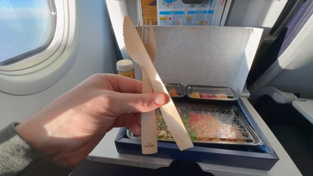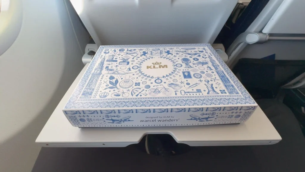 The meal was served in one of KLM’s signature cardboard boxes. Visually, I have to say they do look very cool, and the design is genuinely appealing. At the same time, I still do not think this style of presentation feels fully in line with what you would ideally expect in Business Class. If the same food were plated properly, the overall impression would immediately feel more premium. Even so, I do appreciate that KLM has at least tried to make the box look stylish rather than purely functional.