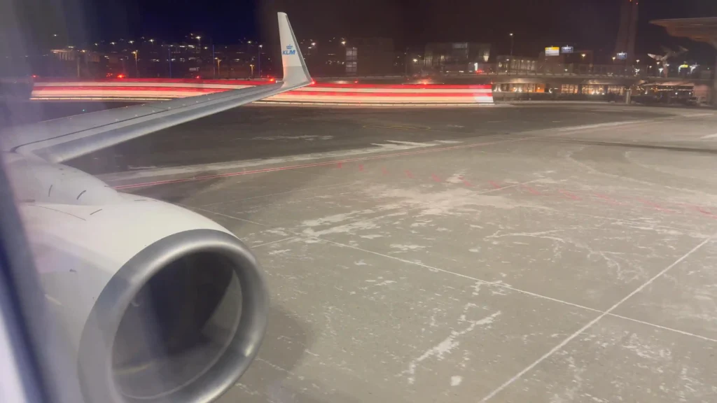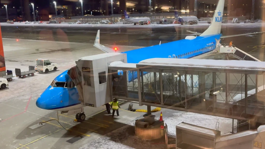 This KLM 737-800 Business Class review covers the full experience from Amsterdam to Oslo on flight KL1205 — including Schiphol Airport, the KLM Crown Lounge, boarding, cabin, seat comfort, food, service, and the scenic winter flight to Norway.