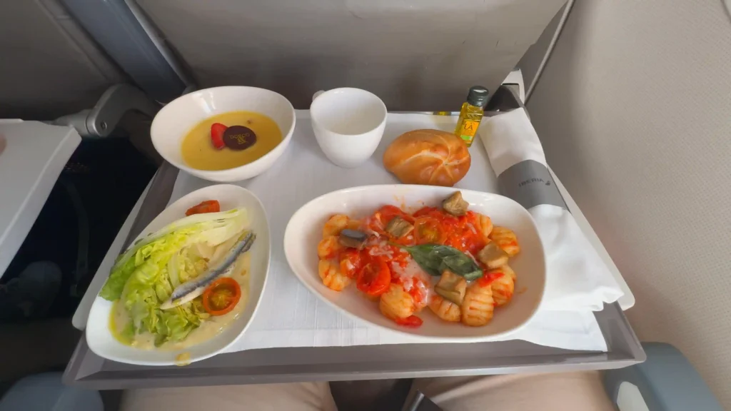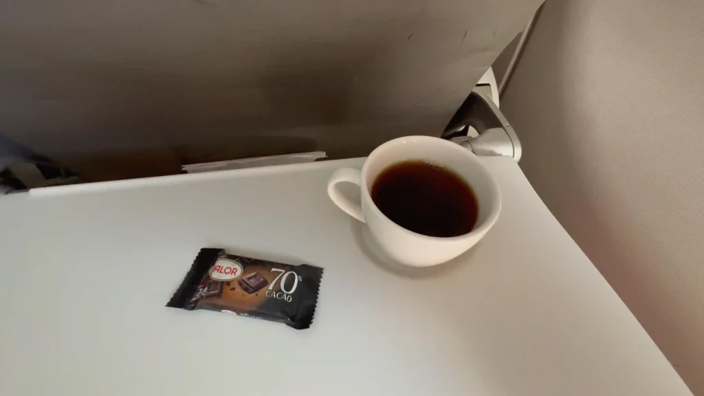 Elegí los ñoquis, y estaban realmente buenos: calientes, reconfortantes y muy por encima de lo típico en vuelos europeos. Después de la comida, el café llegó acompañado de chocolate negro… y estaba absolutamente delicioso.