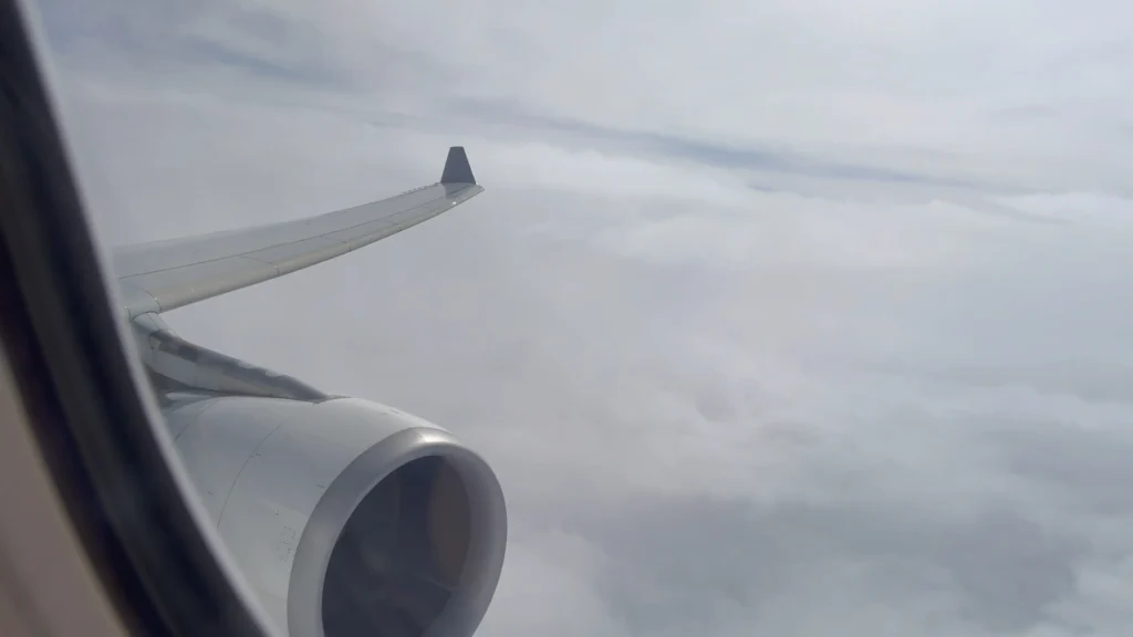 Finalmente hicimos pushback con 45 minutos de retraso, sin que el motivo quedara del todo claro. Con el cielo lluvioso sobre Madrid, rodamos hacia pista y despegamos directo hacia las nubes densas que cubrían la capital. La subida fue un poco movida, con turbulencia ligera, pero una vez alcanzamos la altitud de crucero el vuelo se estabilizó.